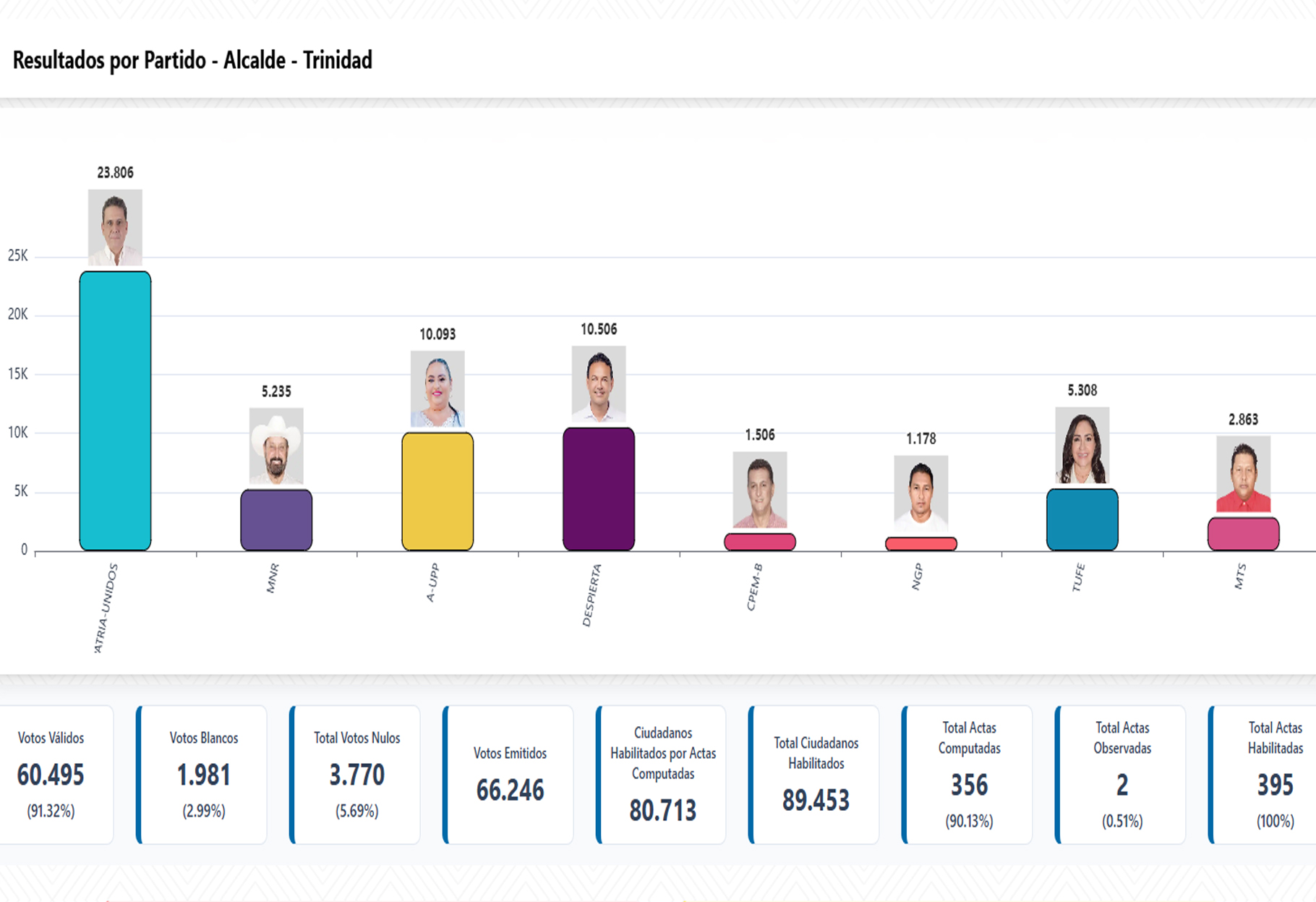 Se están mostrando tendencias en La Paz, Cochabamba, Santa Cruz, Sucre, Tarija, Potosí, Oruro, Trinidad y Cobija. El Alto: También se incluyen los resultados de este municipio clave, donde la participación ciudadana fue alta.