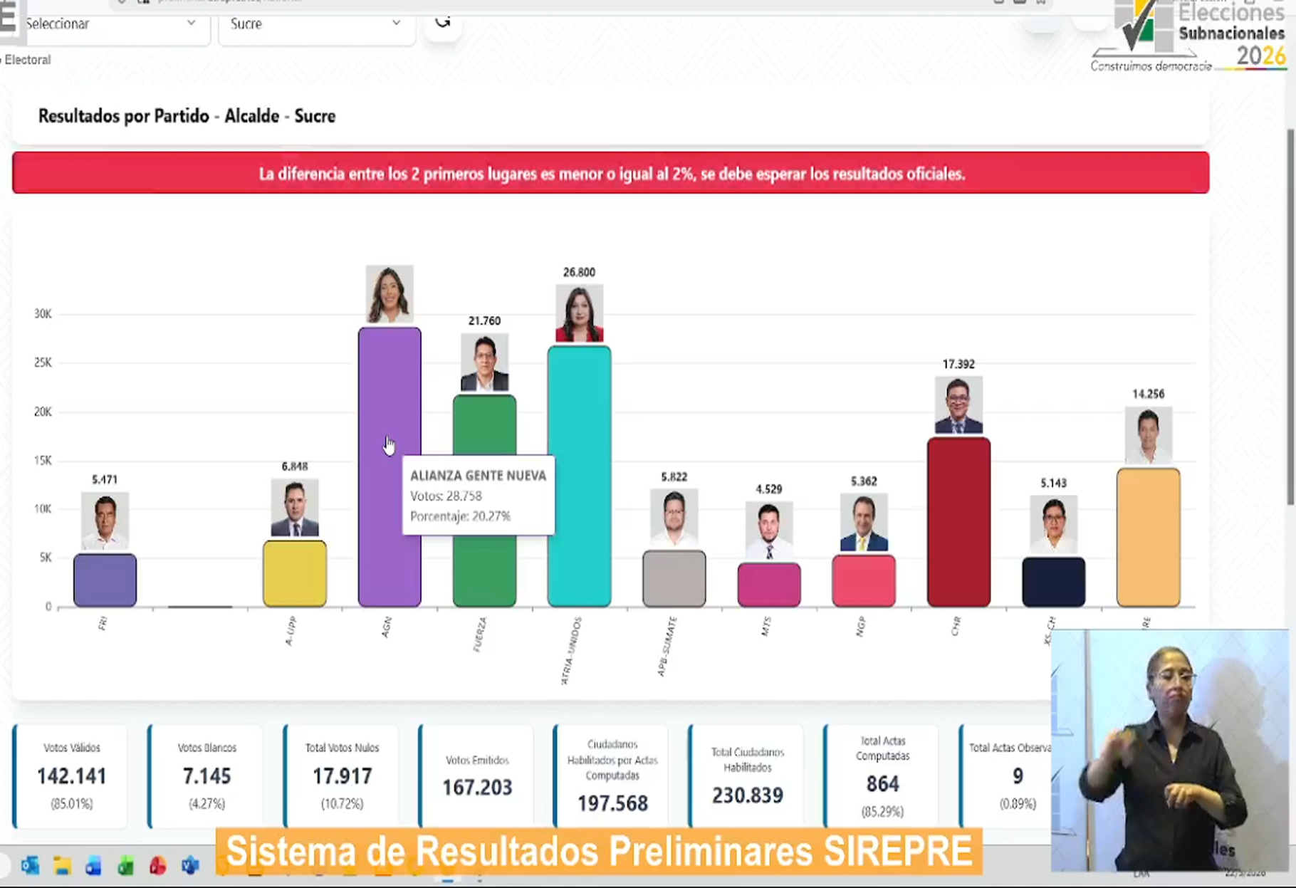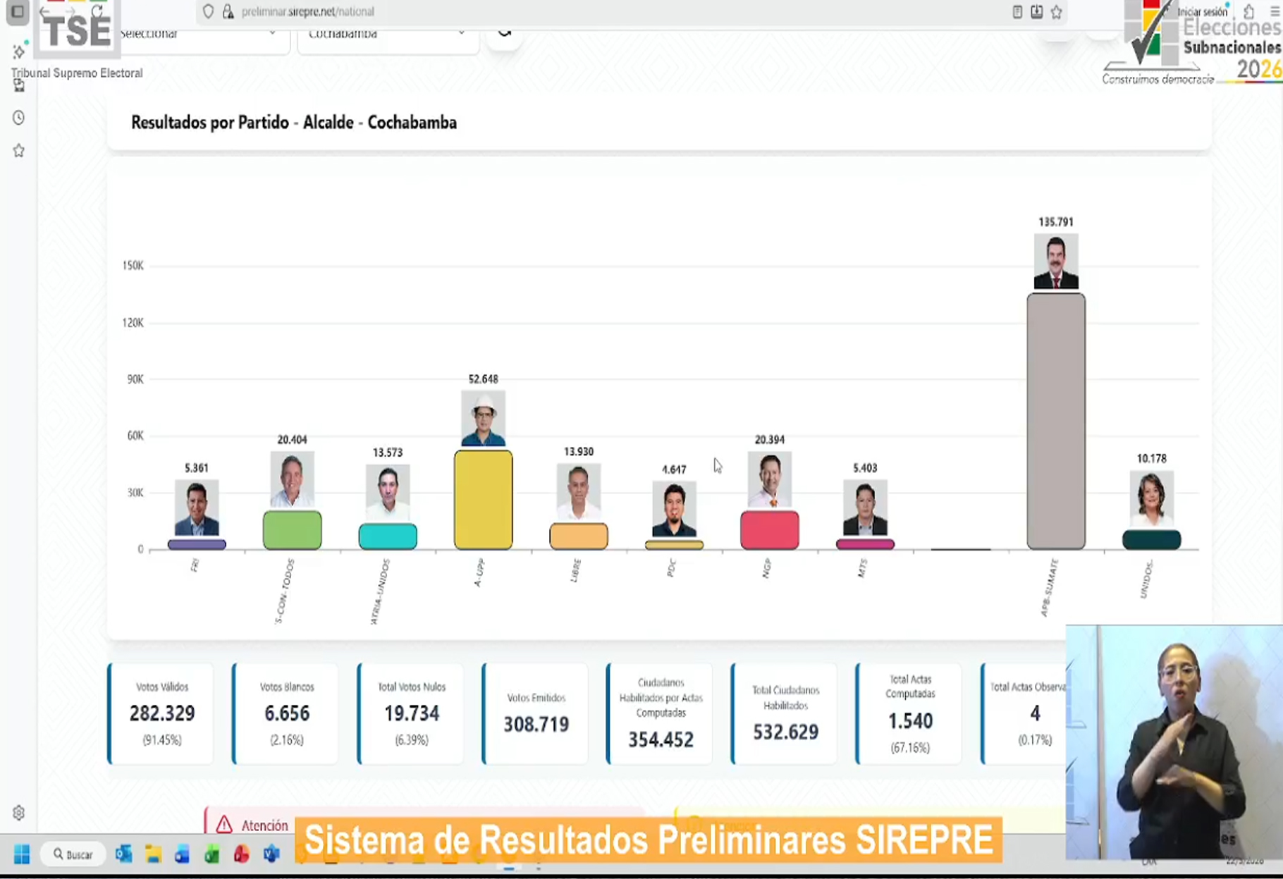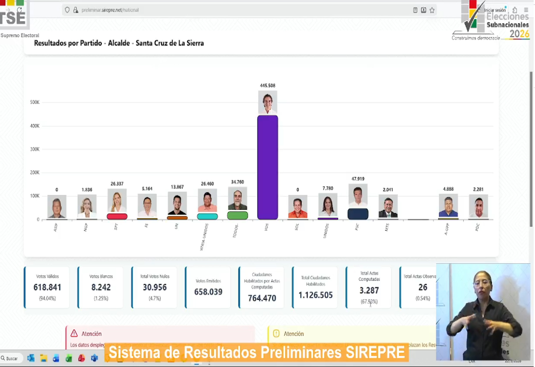 El Sistema de Resultados Electorales Preliminares (SIREPRE) ya comenzó a difundir los primeros datos de las elecciones subnacionales en Bolivia. Alrededor del 80% de las actas han sido procesadas y se muestran tendencias en los municipios capitales y en El Alto, aunque estos resultados son preliminares y no oficiales