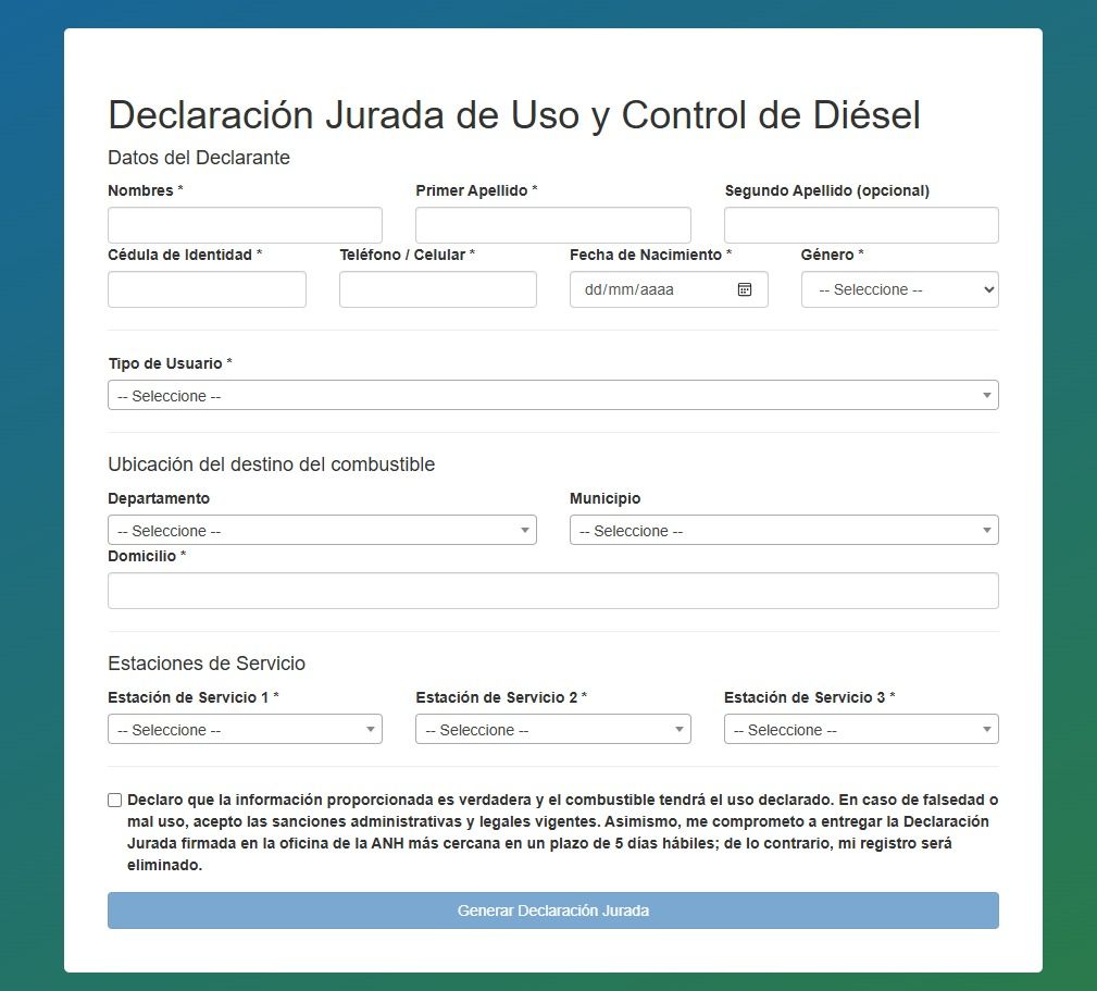 Entre los datos que deben proporcionar los usuarios se incluyen: carnet de identidad, registro previo de la declaración jurada en la plataforma habilitada por la ANH, especificación de la actividad productiva, el volumen mensual requerido, la estacionalidad del consumo y la ubicación de la actividad productiva.