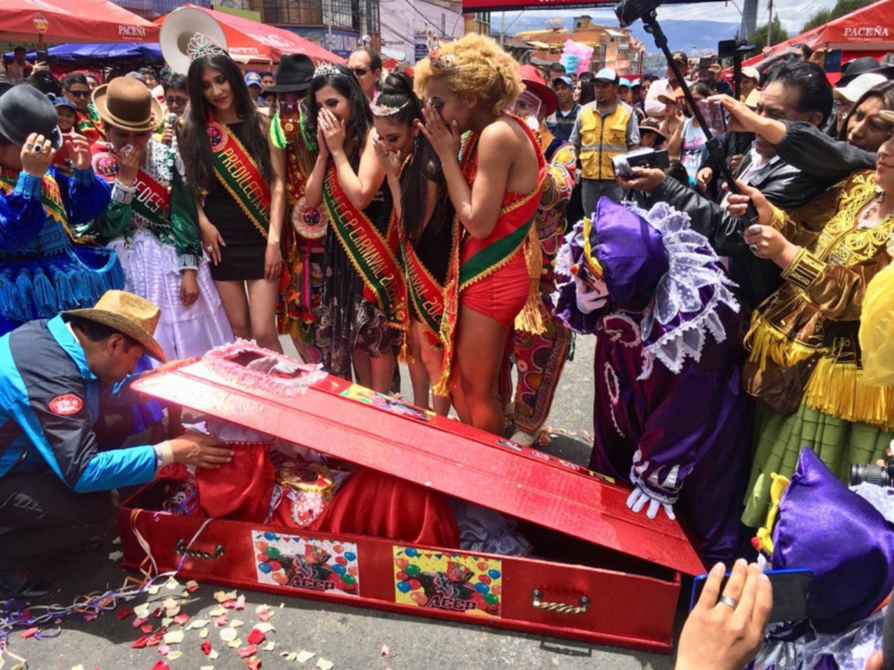 El cortejo partió desde la plaza Garita de Lima, acompañado por comparsas de “viudas”, cholas paceñas y ch’utas, mientras las bandas de bronce llenaban de música las calles. Entre serpentinas y mixtura, el féretro simbólico avanzó por la avenida Baptista rumbo al Cementerio General, donde fue depositado para su descanso anual.