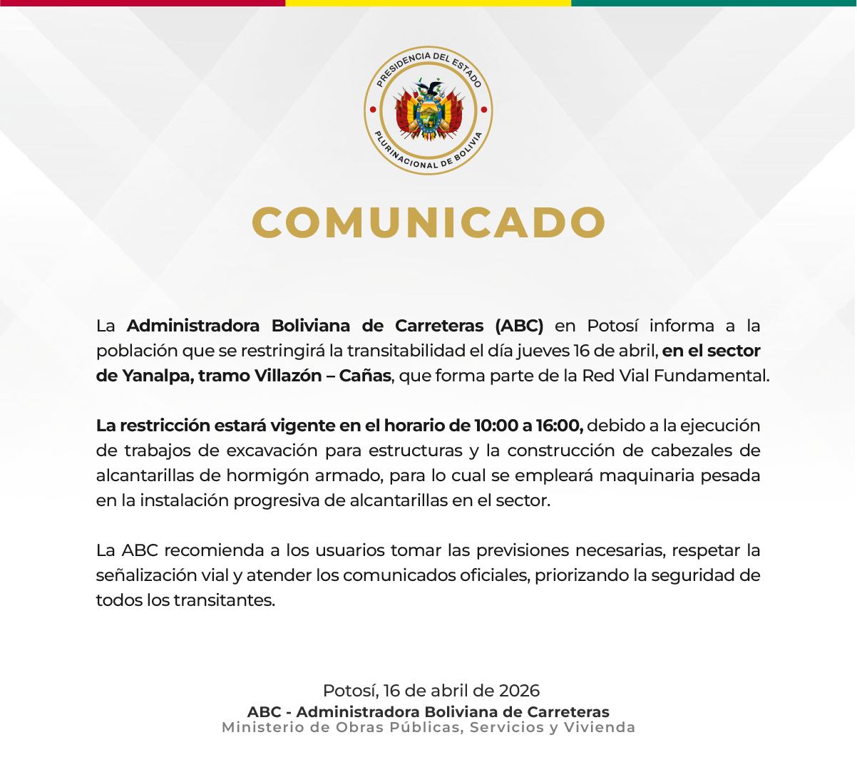 La Administradora Boliviana de Carreteras (ABC) anunció que este jueves 16 de abril se restringirá el tránsito en el tramo Villazón – Cañas, en el departamento de Potosí, debido a trabajos de construcción en la Red Vial Fundamental. La medida regirá desde las 10:00 hasta las 16:00 horas, afectando principalmente el sector de Yanalpa.