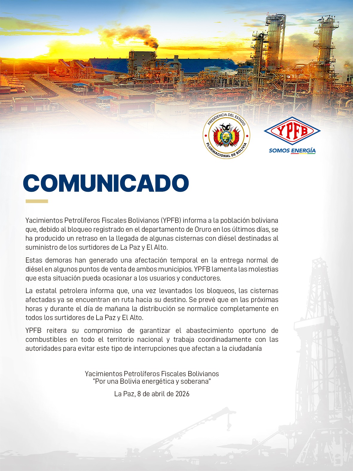 YPFB lamentó las molestias ocasionadas a los usuarios y conductores, asegurando que “se trabaja coordinadamente con las autoridades para evitar este tipo de interrupciones que afectan a la ciudadanía”.