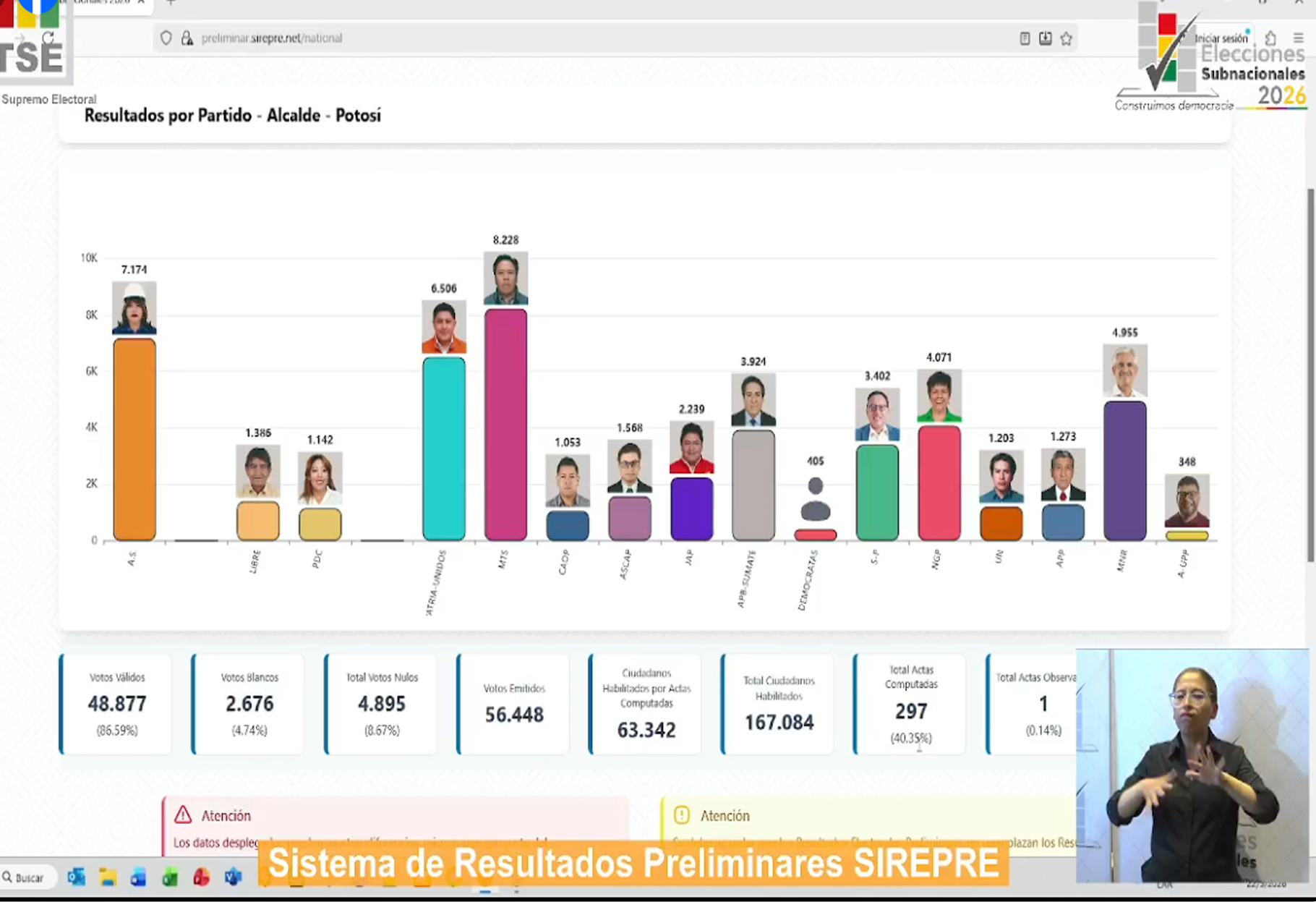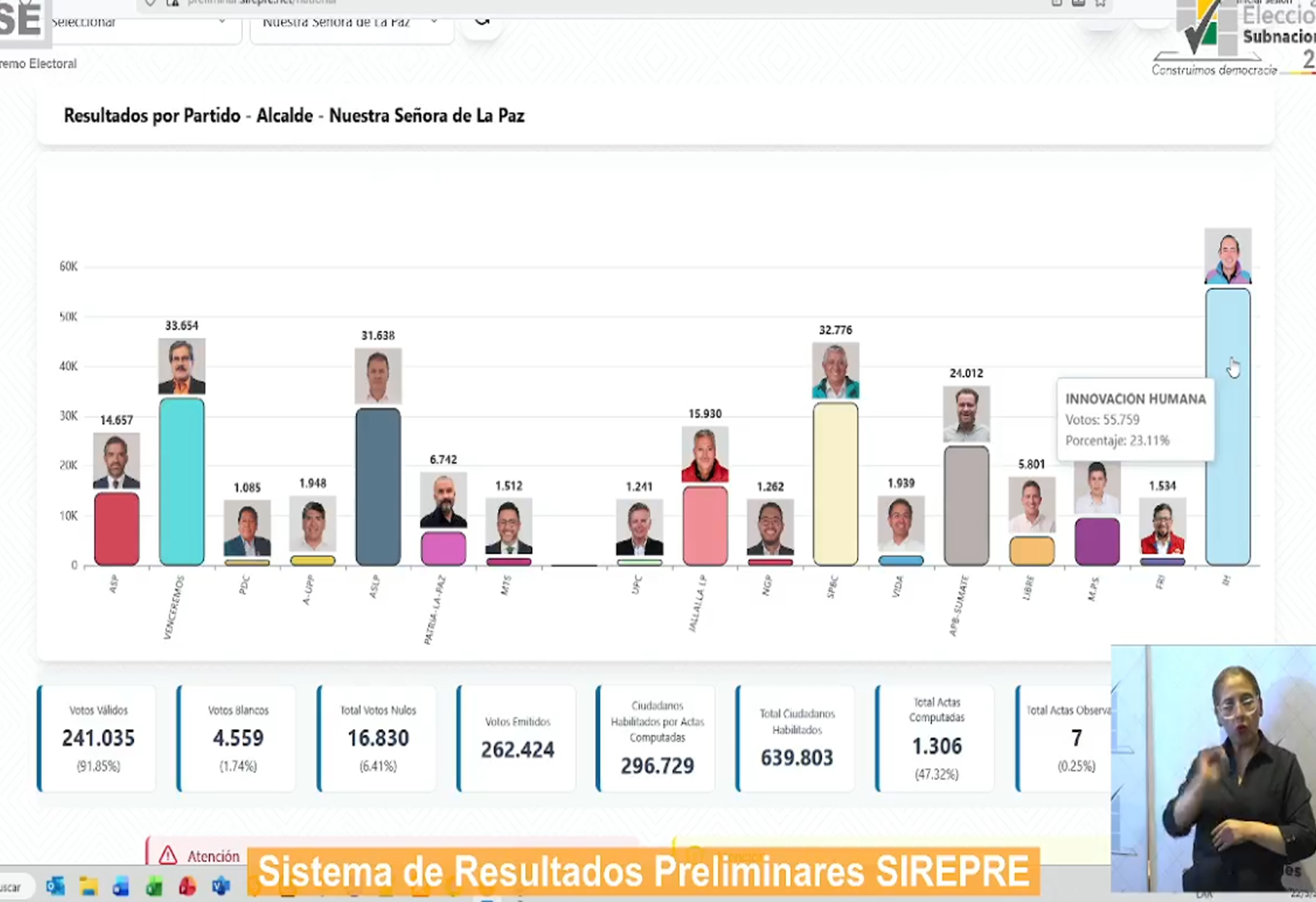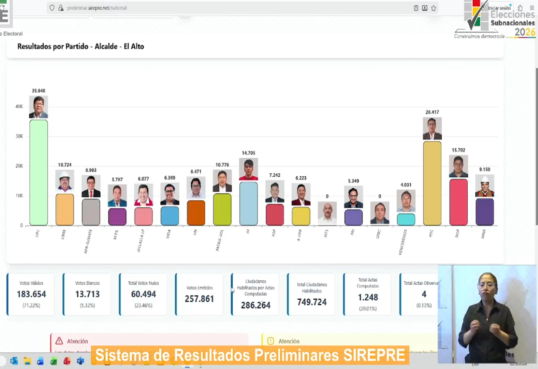El Sistema de Resultados Electorales Preliminares (SIREPRE) ya comenzó a difundir los primeros datos de las elecciones subnacionales en Bolivia. Alrededor del 80% de las actas han sido procesadas y se muestran tendencias en los municipios capitales y en El Alto, aunque estos resultados son preliminares y no oficiales