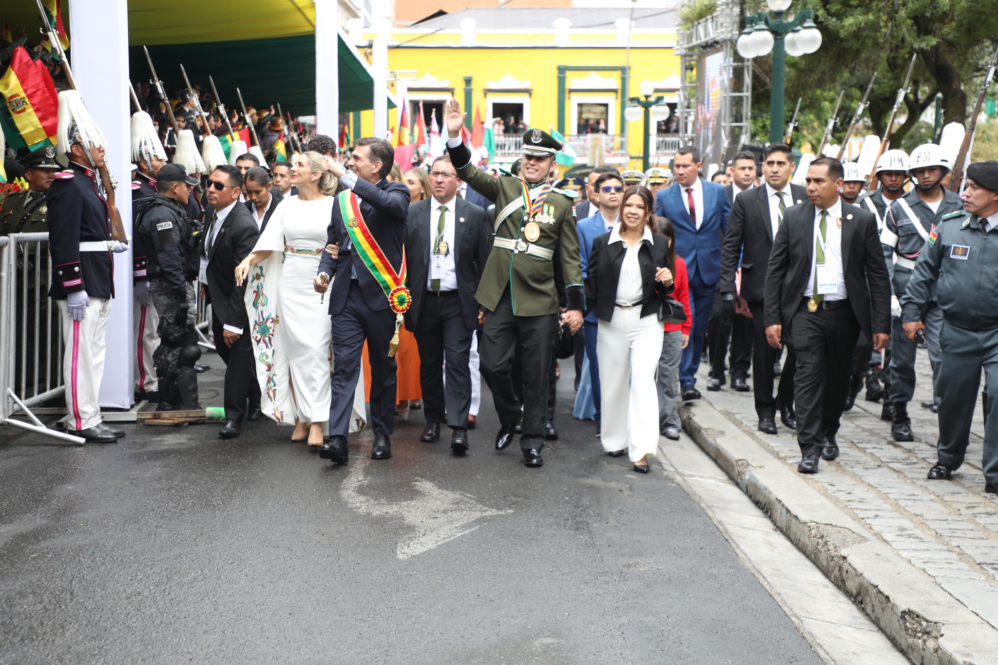 En esta ceremonia, considerada su primer acto oficial como Presidente del Estado Plurinacional de Bolivia, Rodrigo Paz recibió la Gran Cruz de la Orden y la Medalla del Bicentenario de las Fuerzas Armadas, en reconocimiento a su liderazgo y compromiso con la patria.