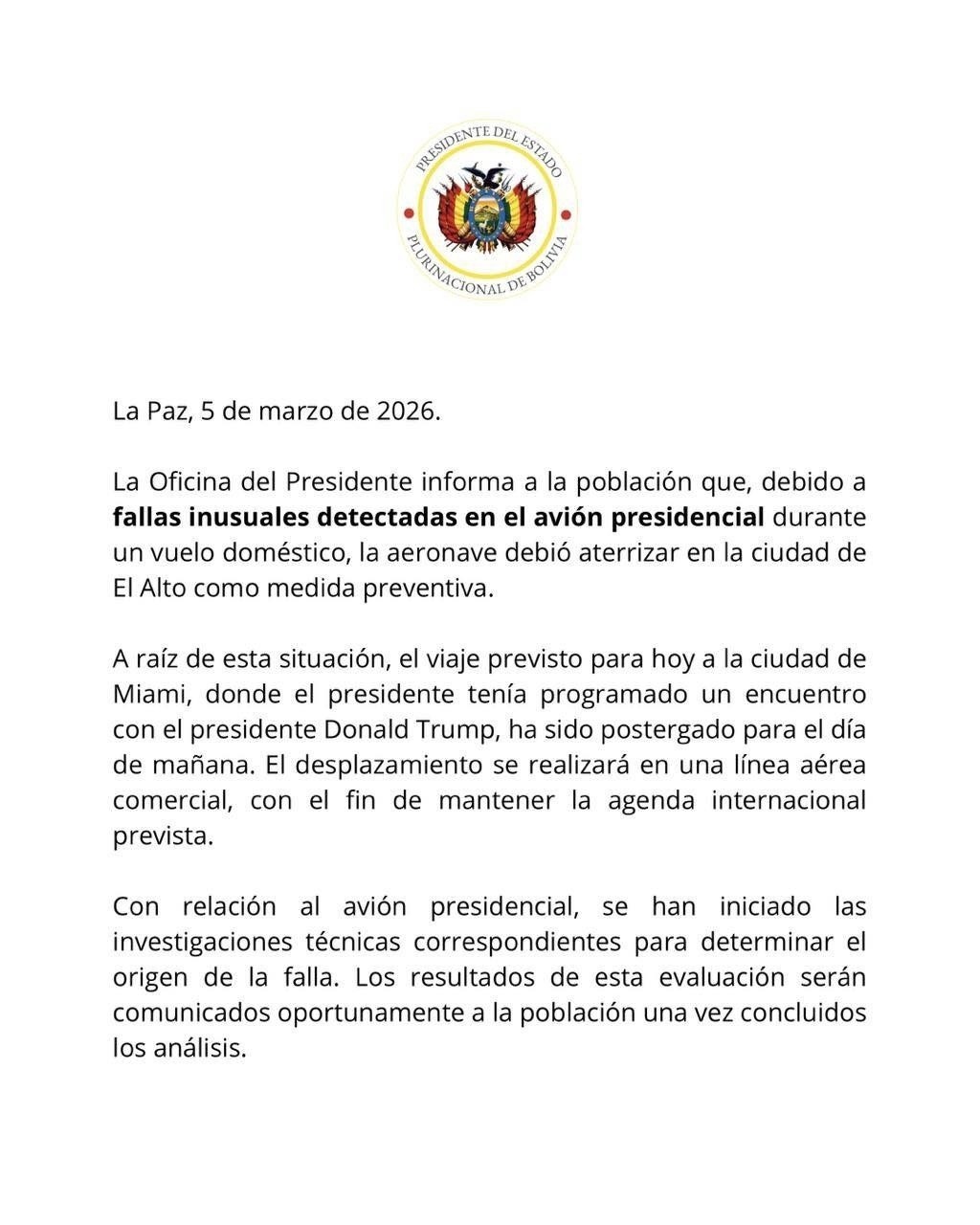 Según comunicado oficial la tripulación decidió descender preventivamente tras detectar anomalías técnicas en la aeronave, priorizando la seguridad del mandatario. El aterrizaje se realizó sin incidentes.