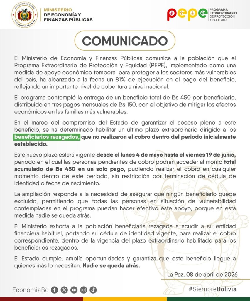 El Ministerio de Economía y Finanzas anunció la ampliación del plazo extraordinario hasta el 19 de junio para que los beneficiarios rezagados del Programa de Protección y Equidad (PEPE) puedan cobrar el apoyo económico acumulado de Bs 450.