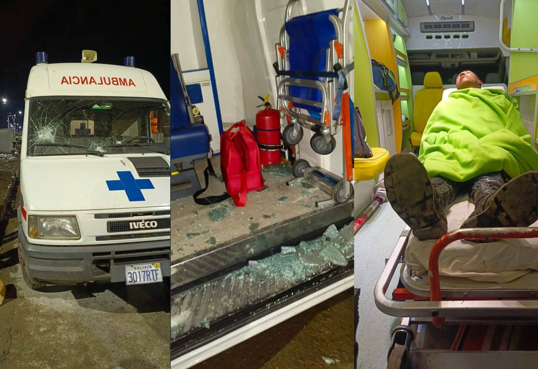 - Sistema de auxilio 167 del municipio de La Paz. una ambulancia afectada con un médico que fue herido con una herida cortante, el chofer con contusión mandibular, ambos por impacto de una piedra