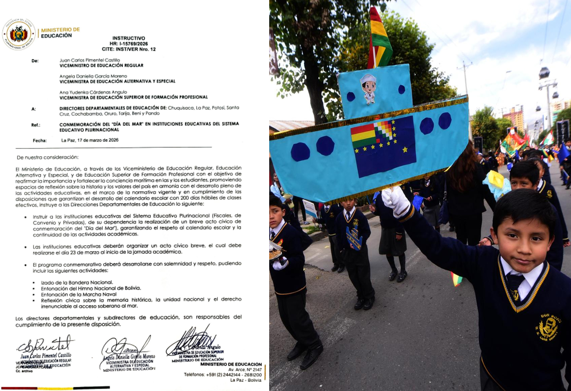 El instructivo oficial señala que el acto debe realizarse al inicio de la jornada escolar e incluir actividades como el izado de la Bandera Nacional, la entonación del Himno Nacional y la Marcha Naval, además de una reflexión sobre la memoria histórica y el derecho irrenunciable de Bolivia al acceso soberano al mar.