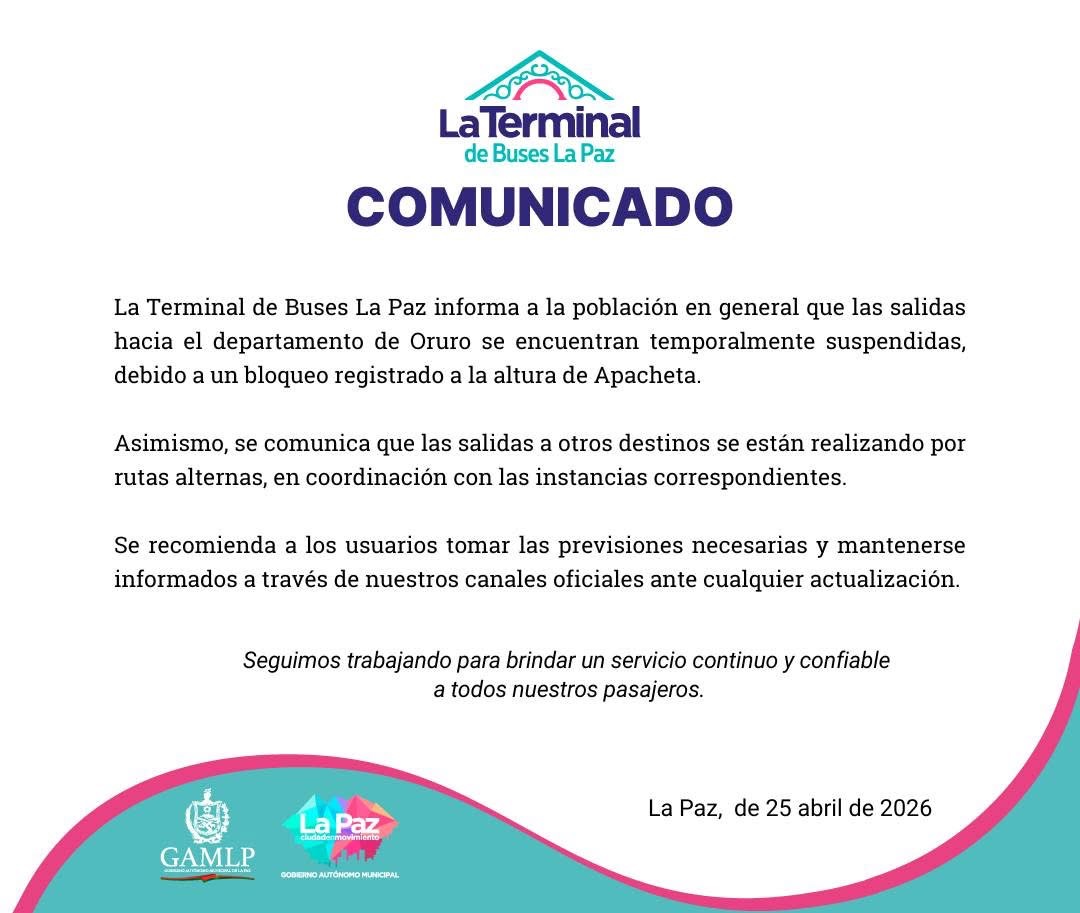 La Terminal de Buses de La Paz informó este sábado que las salidas hacia la ciudad de Oruro se encuentran suspendidas de manera temporal debido a un bloqueo instalado en el sector de Apacheta, en la carretera que conecta ambas ciudades. La medida afecta directamente a cientos de pasajeros que tenían previsto viajar en esta ruta.